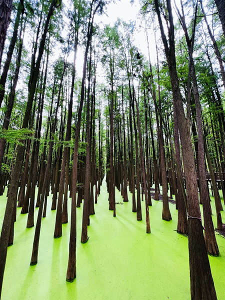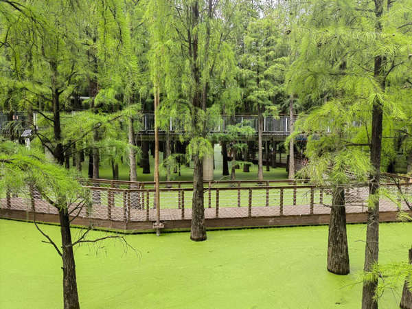 这里种植着一大片罕见的池杉树,奇特的杉树在水中生长,枝繁叶茂,高耸入天,光影稀疏,池中铺满了绿色的浮萍,又吸引了绿头鸭前来觅食,趣味十足,此时若是能坐上皮划艇,在树林中滑行,就有一番“树在水中长,船在林间行,鸟在枝上鸣,人在画中走”的美妙景致了。大家走走停停,闯入森林深处,感受着森林中满满的负离子清新。这片巨大的水上森林,似一抹诗情画意的绿,就像一块翡翠镶嵌在碧水之上。要是进入深秋时节,绿色的杉树叶会变成红色,想必这浓墨重彩的景色宛若油画般美吧。
